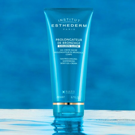 - Aplica, Prolongador del Bronceado Gel-Crema Acabado Golden Glow Institut Esthederm, generosamente sobre el cuerpo después de la exposición al sol y diariamente después de las vacaciones. .