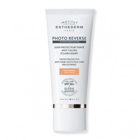 Photo Reverse Beige Médium Institut Esthederm es una crema facial solar antimanchas con color que no permite el bronceado y que aclara, previene y corrige la hiperpigmentación. Este tratamiento solar antimanchas de alta protección protege de los rayos UVB y UVA, inhibe el proceso de pigmentación y permite un aclarado progresivo de la piel.