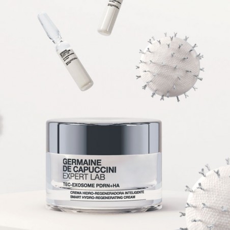 La línea Expert Lab de Germaine de Capuccini incorpora el núcleo tecnológico TECXOSOME, basado en tecnología de exosomas de origen vegetal, que actúa en sinergia con otros activos para favorecer los procesos naturales de reparación cutánea.