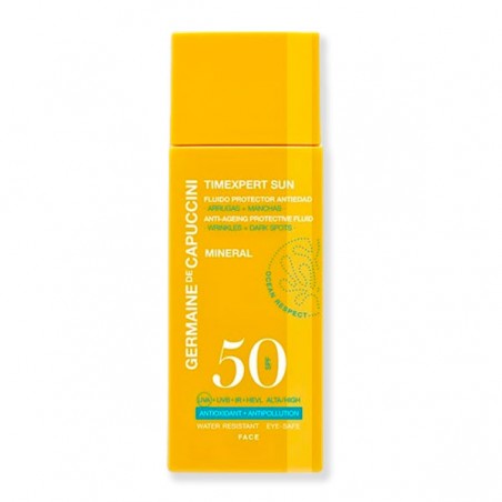 Fluido Solar Mineral SPF50 Timexpert Sun Germaine de Capuccini es un protector solar facial con filtros 100% minerales que ofrece una protección muy alta frente a la radiación solar mientras ayuda a prevenir el fotoenvejecimiento.
