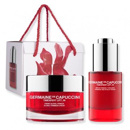 Pack Timexpert Lift_IN Germaine de Capuccini es un tratamiento reafirmante intensivo que restablece la firmeza de la piel que contiene la Crema Timexpert Lift In y el Sérum Timexpert Lift In con el objetivo de ayudar a reforzar el colchón cutáneo, alisando la piel desde el primer instante de su aplicación. Su uso diario, redefine el óvalo facial, redensifica la piel, difumina las líneas de expresión y las arrugas desde el interior para que quede plasmado en el exterior. Además, genera un delicado film envolvente de efecto "segunda piel" con propiedades antiedad, protectoras y potenciadoras del efecto lifting. Sus beneficios realizan un rejuvenecimiento cutáneo diario, elevando, rellenando y tensando la piel. Gracias a este tratamiento reafirmante intensivo obtendrás una sensación de frescor, suavidad y bienestar en tu piel.