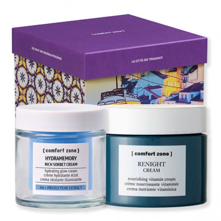 Pack Comfort Zone día y noche es un pack promocional de rutina de día y de noche sencilla pero eficaz. El nuevo THE CITY OF SUNSETS LISBOA combina dos cremas específicas, hidratante y nutritiva. Contiene Hydramemory Rich Sorbet Cream de 50ml, y recargable, y Renight Cream de 60ml.