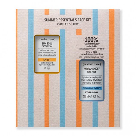 Incluye Face Cream SPF50 Sun Soul Comfort Zone, que protege la piel frente a los rayos UVA/UVB, y Hydramemory Face Mist, que aporta hidratación inmediata y una sensación de frescor al instante.