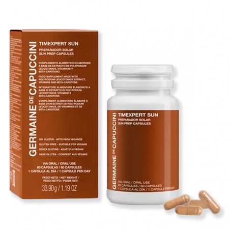 Preparador Solar Timexpert Sun Germaine de Capuccini es un complemento de nutricosmética solar diseñado para preparar la piel antes de la exposición solar. Su fórmula ayuda a reforzar la piel desde el interior, favoreciendo un bronceado más uniforme y ayudando a protegerla frente al daño solar.
