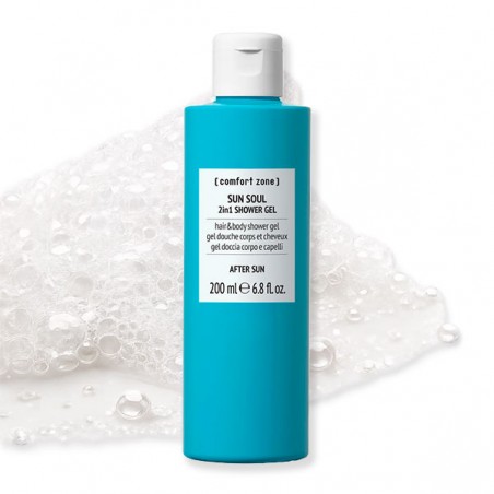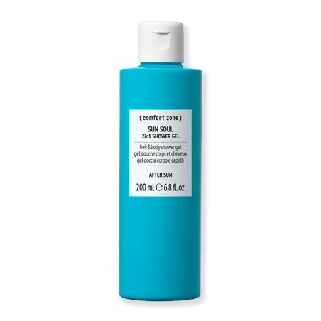 Shower Gel Sun Soul Comfort Zone es un gel de ducha 2 en 1 diseñado para limpiar suavemente la piel y el cabello después de la exposición solar o en el día a día. Su fórmula delicada elimina residuos de sal, cloro y protector solar, dejando una sensación de frescor y confort.