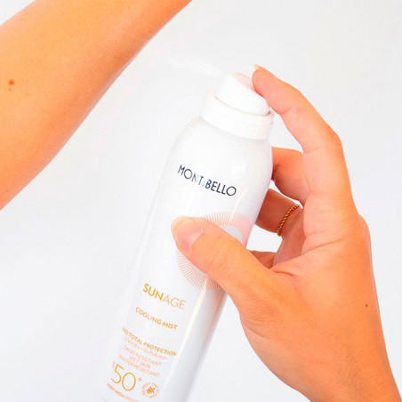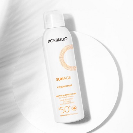 Cooling Mist SPF50+ Sunage Montibello es una bruma solar corporal de protección alta que aporta hidratación y frescor a la piel. Es eficaz sobre la piel mojada y además es resistente a la arena. Está testada dermatológicamente y su fórmula es respetuosa con los océanos.